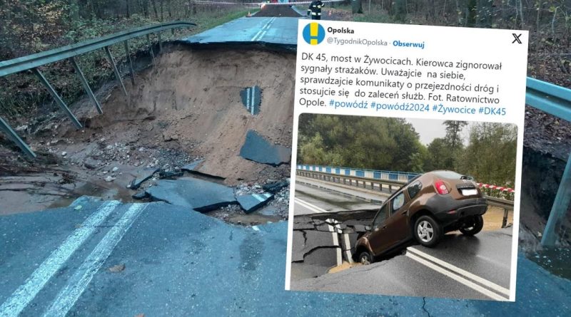 Powódź przerwała most na DK45 w Żywocicach pod Krapkowicami. Chociaż trasa z Raciborza do Opola jest przez to nieprzejezdna, pewien kierowca zaryzykował, ignorując ostrzeżenia służb. Internet obiegły zdjęcia rumuńskiego SUV-a uwięzionego w wielkiej wyrwie.